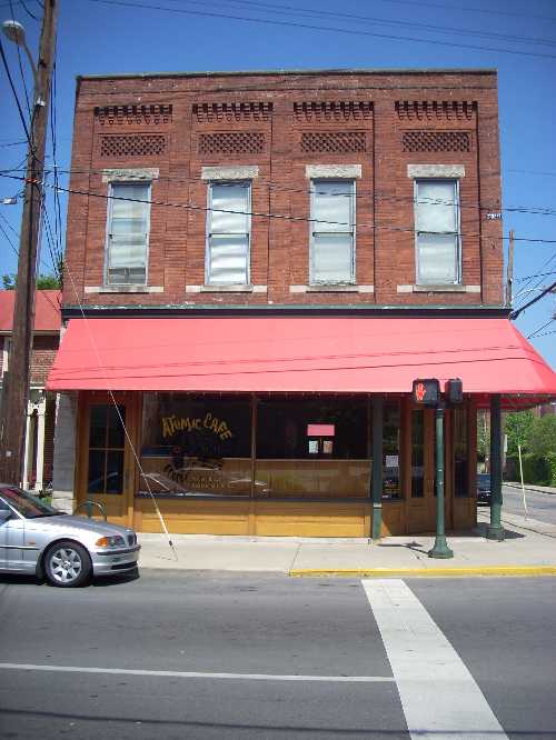 The Atomic Cafe is Lexington's Caribbean restaurant. It's on the edge of the Transylvania University campus so on Fridays and Saturdays it is very crowded. The kitchen is slow. You need to find a table in the courtyard out back, place your order, enjoy the music, make good conversation and let the meal unfold leisurely. Their definition of "Caribbean" is a little different from the islands. What they claim is "pulled" or "jerked" is not what you would get there or at any other Carib restaurant in the U.S.. However, do not let this dissuade you from eating here. Whatever they label the food, it's good and plentiful. The traditional corner entrance in the photo at left is misleading. The heart of the restaurant Spring, Summer and Fall is the courtyard out back. Enclosed by a brick wall, it has its own bar and live music. If you can get a table back there, it's one of Lexington's better places to enjoy a meal. The menu opens with some of the more creative appetizers in town. We like their Sweet Potato Chips, Conch Fritters, Roast Pablano Peppers, and Jamaican Meat Patties. There's only one soup permanently on the menu but it's a good one : Conch Chowder. Atomic offers three basic salads, but we recommend the spectacular Tiki Salad, which gives you mixed greens with jerked chicken strips, black beans, cottage cheese, palm hearts, red peppers, carrot strips and green onion coconut dressing. We know people who come just to make a meal of this salad. Kids love the Macaroni & Cheese, blending cheddar and cottage cheeses for a slightly different taste. The Chicken Pot Pie is a great version of this classic dish. Of the main entrees, we like Ropa Vieja, an island pot roast; Jerked Chicken; Pork Tenderloin Skewers; Banana Leaf Wrapped Mahi Mahi with peppers, onions and artichokes enclosed; Shrimp - Chicken Kabob; and The Island Sampler, a mix of jerked chicken, fish fritters, coconut shrimp, black beans, rice, peppers, onions, and whatever strikes the chef's fancy on that particular evening. Among desserts we like the Rum Butter Cake With Berries, Chocolate Cheesecake, and Red Banana Cake. 265 North Limestone. From the Hyatt, walk east on Vine, turn north on Limestone and walk five blocks. But they're the short side of the blocks. |