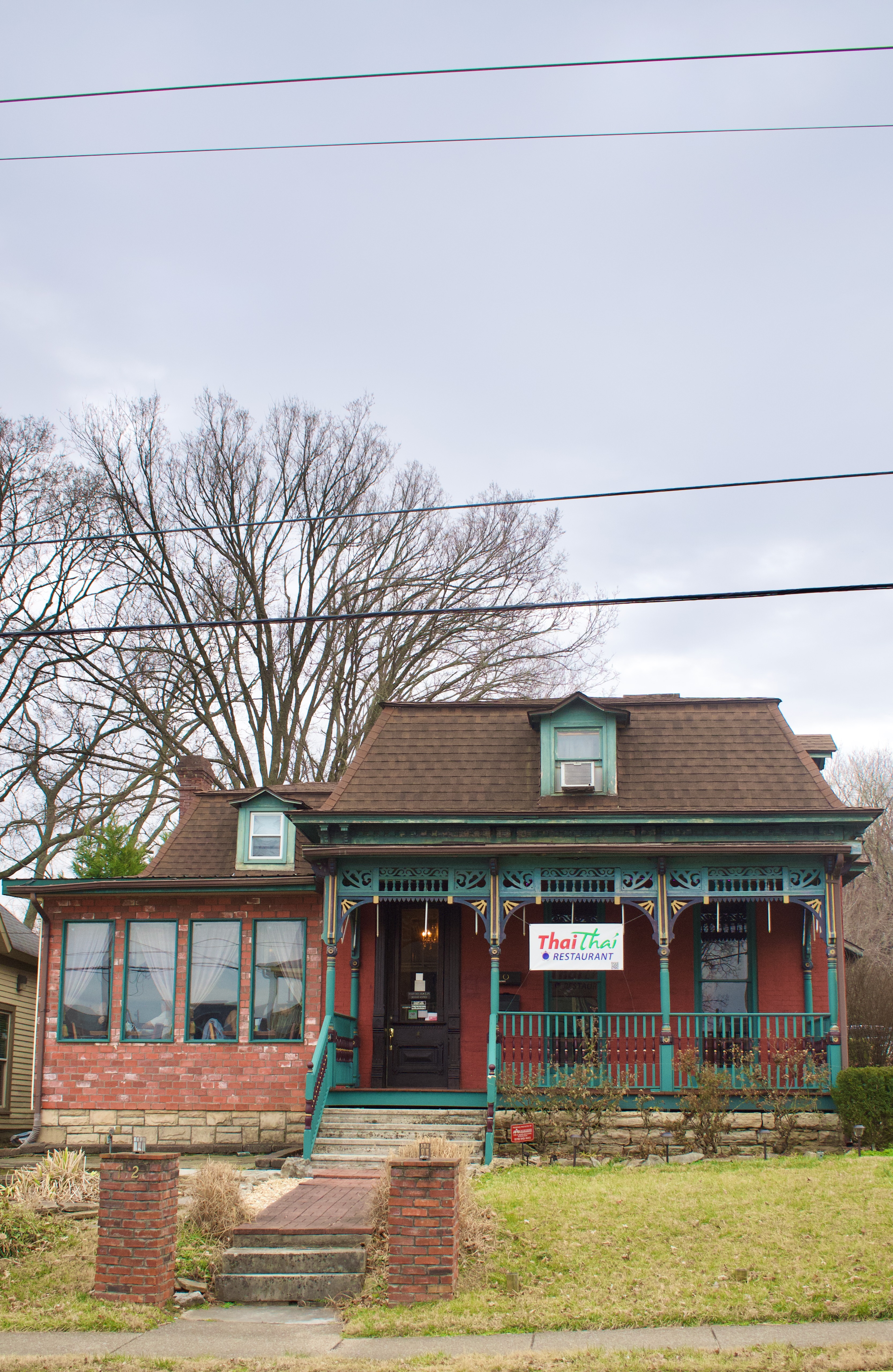 Thai Thai at 712 Chestnut (a block above the square) is an outstanding restaurant. It's not only one of the best Thai restaurants in Kentucky, but it's one of the best restaurants of any kind in Bowling Green and is in a beautifully remodelled and restored 1870 residence that makes dining there feel like a very classic experience. To start with, you need to order a pot of Tea. Their best flavor is Pomegranate, but there are several. Thai teas have a very delicate taste, so you need to allow the pot to steep for several minutes after it arrives at your table. The tea is served in exquisite cups and one pot should last one person for a meal, but each diner should order his or her own. Appetizers include Satay Chicken, Crab Rangoon and Fish Cakes. There are six Soups, of which the Tom Kha (coconut milk, herbs and curry) is the star. Tell the waitress to tell the kitchen to hold all the vegetables so they don't dilute the rich flavor of the broth. Of their eight Salads the stars are the Yum Nue (thin steak slices, red onion, green onion, cilantro, lettuce and Thai sauce) and Som Tam (papaya, shrimp, peanut, garlic, chiles and lime). Noodle/Rice dishes include Pad Thai (fried noodles, chicken, shrimp, egg, bean sprouts, onions, chopped peanuts), Crab Fried Rice (jasmine rice, crabmeat, onion, peas, carrots, egg) and Pineapple Fried Rice (jasmine rice, pineapple, shrimp, chicken, onion, cashews). Their signature Entrees are the Basil Eggplant (stir fried chicken/beef, onion, eggplant, broccoli, carrot, zucchini, chiles and basil), and Sweet & Sour (spicy sweet and sour sauce, chicken/beef, pineapple, tomato, cucumber, scallion, zucchini and onion). Despite its name, the Basil Eggplant includes as much beef as eggplant. The eggplant is not fried but baked. You might ask the waitress to ask the kitchen to hold the broccoli, as thay are very generous with it. However, they also serve the Classics : Masaman Beef (braised USDA London Broil in masaman curry sauce, onion, potatoes), Lamb Basil, and Roast Duck. They can adjust your spice level on a 1-10 scale. On a first visit start with a 1; anything above a 3 is blazing hot. Allow time for very slow service.
