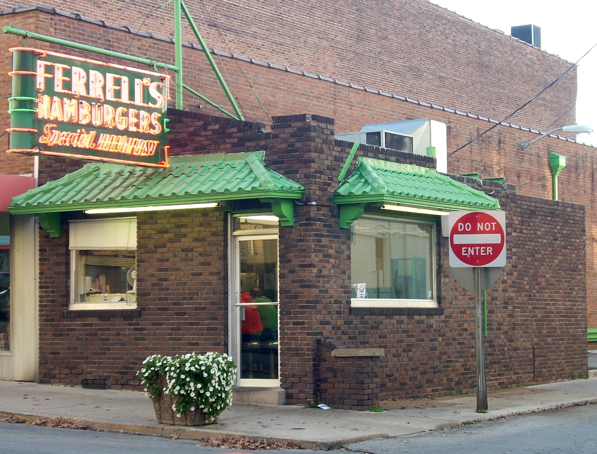Ferrell's is a classic hamburger joint. They fix only hamburgers. There's a counter with a few seats and Mrs. Ferrell fixes your burger while you watch. You can top it with cheese, onions, lettuce, tomato, mustard, or ketchup. The place has been at the same Main Street location in downtown Hopkinsville, a block South of Route 80, since 1929. Mrs. Ferrell is 89. She's have been there from the start, although the original owner, David Ferrell, has died. This is a Hopkinsville icon. It has its own webcam, facebook page, and loyal fans who stop by daily or whenever they're in town. It will be the smallest restaurant you've ever seen. The Health Department has issues. They complain that Mrs. Ferrell uses the same hands to handle money, unpack buns and roll the patties. None of this fazes the customers, who also ignore the recent price increases, which Mrs. Ferrell says were necessary because the electric bill went up. Mrs. Ferrell peppers the burgers. Some people complain it makes them "hot." Mrs. Ferrell says it makes them "lively." Apparently most Hopkinsville burger fans like theirs lively. |