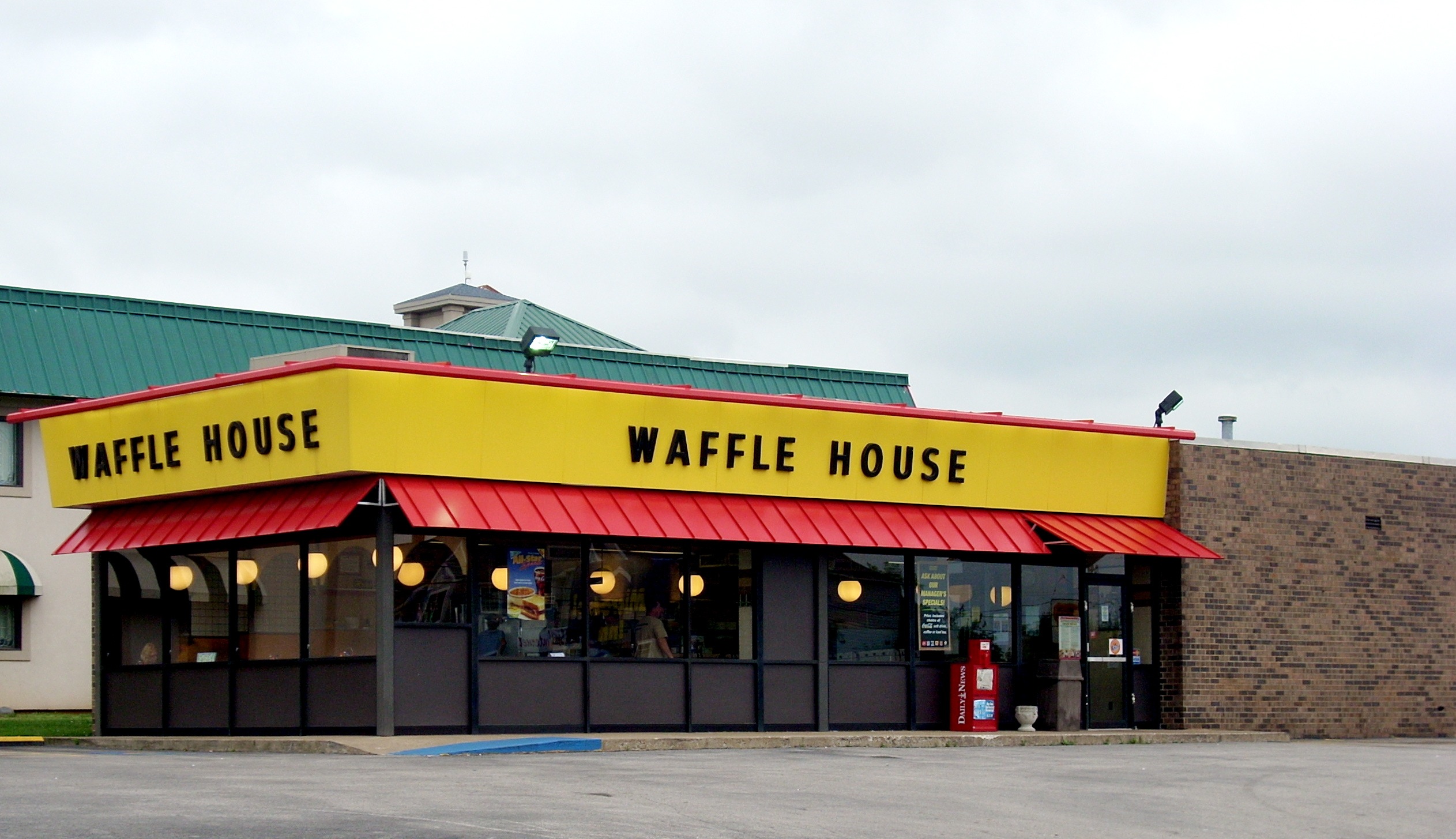 Waffle House is famous for their waffles but ironically their menu features everything else. They promote their Steak & Eggs, Pork Chops & Eggs, Grilled Chicken & Eggs, Omelettes (Cheesesteak, Chili Cheese, Jalapeno and Ham & Cheese), Egg Sandwiches, Hash Browns and classic EggsnBacon or Ham & Egg plates. They're also pretty proud of their biscuits, sausage and bacon sides. Then, over there in the corner, they get around to their Waffles. Their basic is the classic Butter Milk Waffle. There are Double Waffles and Waffles With Sausage or Ham or Eggs. You can pick from Pecan, Chocolate Chip, Blueberry and Strawberry. Actually, we regret the evolution of Waffle House. Way back there, they served ONLY waffles, two pages of every variation imaginable. We could try waffles here we could never find anywhere else and couldn't fix ourselves. Now they've diversified, but the waffle choices are narrowed. Luckily, they still do a good job, with waffles and everything else. |