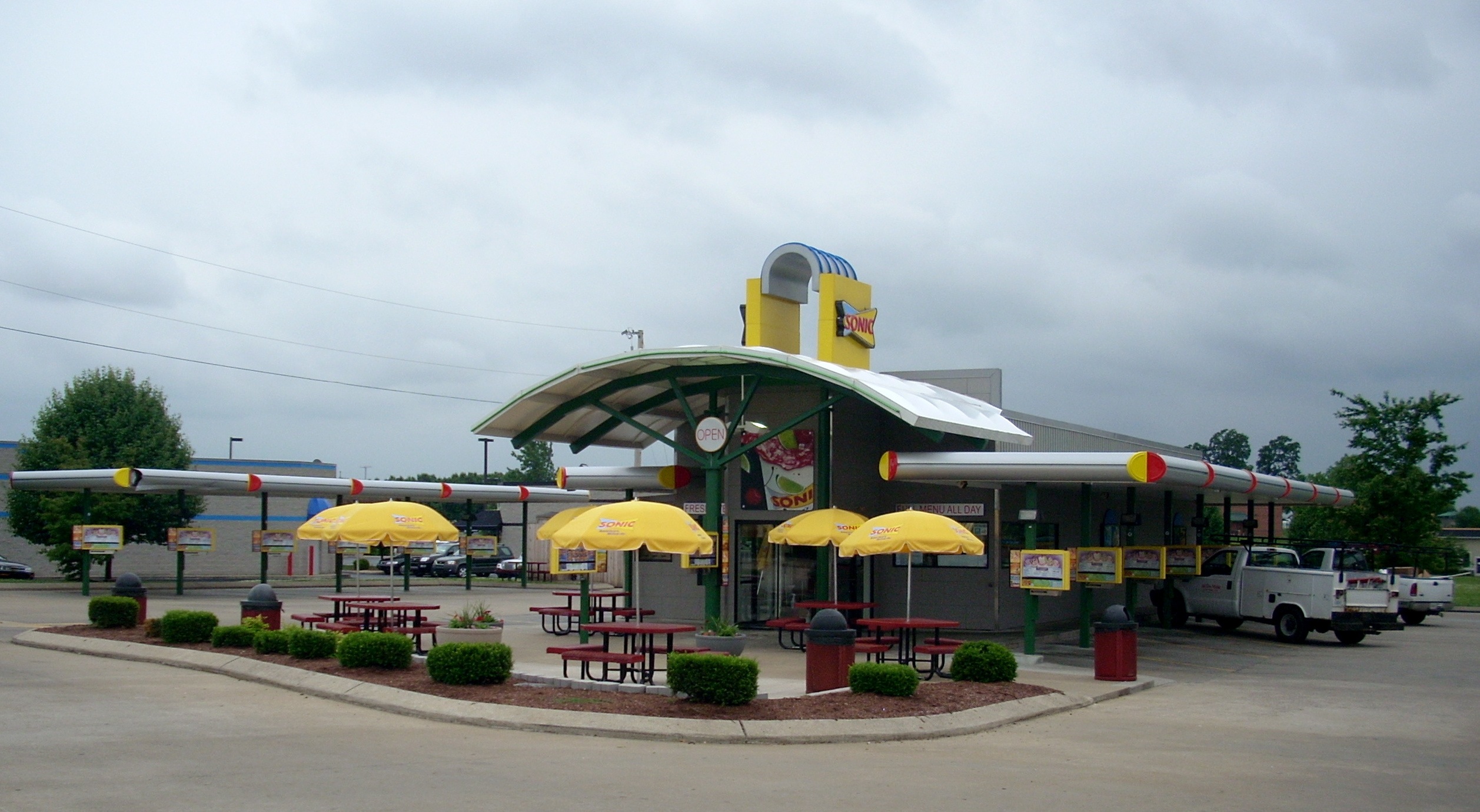 Sonic is a retro drive in restaurant where for half an hour or so you can pretend you're back in the 1950s. They even have girls on roller skates coming out to take your order and carrying your food out on trays which hook onto your car window. The menu is the classic burger, fries, shake and ice cream, although they've updated it a little with Nachos, Onion Rings and Chicken Nuggets. They play Golden Oldie music over the speakers. On Fridays and Saturdays it's a frequent stop for guys cruising in their restored 50s and 60s cars, so you might want to bring your camera. There are a few picnic tables set up under umbrellas so you can sit outside and enjoy the ambience. |