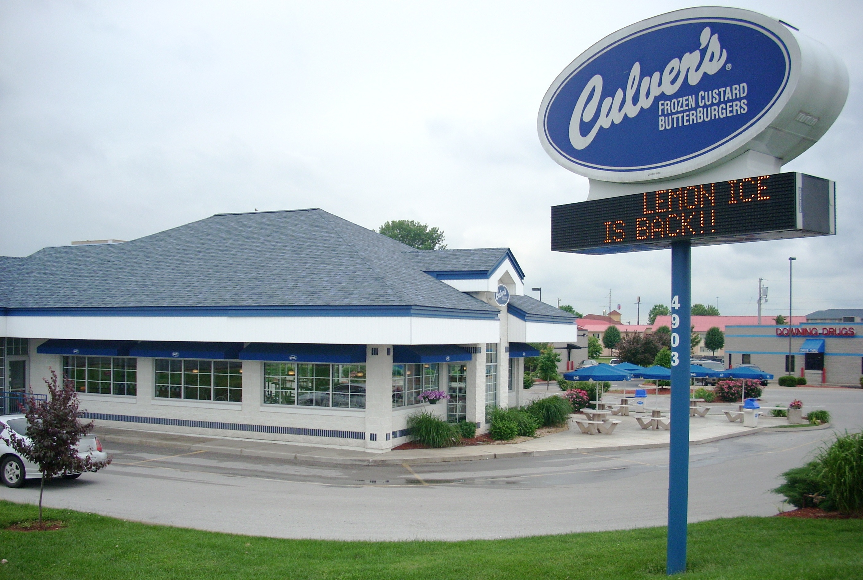 Culver's might be referred to as Upscale Fast Food. The Wisconsin based menu features a core of fried foods with various custard based desserts and their famous Butterburger, using a heavily buttered bun and high quality beef patties. Culvers restaurants are sit down outlets, but you order from the counter and they bring your food to you. There are five full dinners : Fried Chicken, Cod, Shrimp, Pot Roast and Chopped Steak. There are six burgers and two melts, 10 sandwiches and a Grilled Reuben Wrap. Five Salads, a Soup of the Day and four classic sides (Mashed Potatoes & Gravy, Cole Slaw, Green Beans and Fries) round out the menu. |