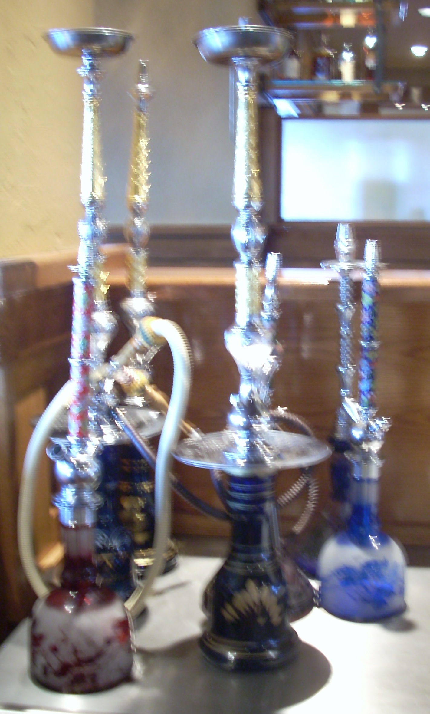 Central to the Jordanian experience is the Hookah, several of which are seen at left. This is the Middle Eastern approach to smoking. The apparatus consists of a bottom bowl of glass which contains water, and a brass regulator which appears as the top. The regulator takes the smoke from the tobacco when the person inhales from the hose. Unlike pipes, cigars and cigarettes, the tobacco in a Hookah is not burned. It is cooked. The tobacco is placed in the bowl with the water and covered by a solid piece, today usually aluminum foil, with numerous small holes in it. The flavor of the tobacco is thus cooked out of it, rising to flow through the hose and reach the inhaler. Tobacco flavors are much richer than Westerners put in their cigarettes. Petra stocks Apple, Peach, Watermelon, Orange, Watermelon, Mango, Passion Fruit, Cherry, Cantaloupe, Apricot, Lemon, Mint, Grape and Cappucino. Thus far, the most popular in Lexington have been Apple, which has subtle hints of anis (licorice), Peach and Mint. Users will often check out a Hookah, retire to the patio, and order a drink from the bar. They will then spend a leisurely evening smoking, drinking and talking. |