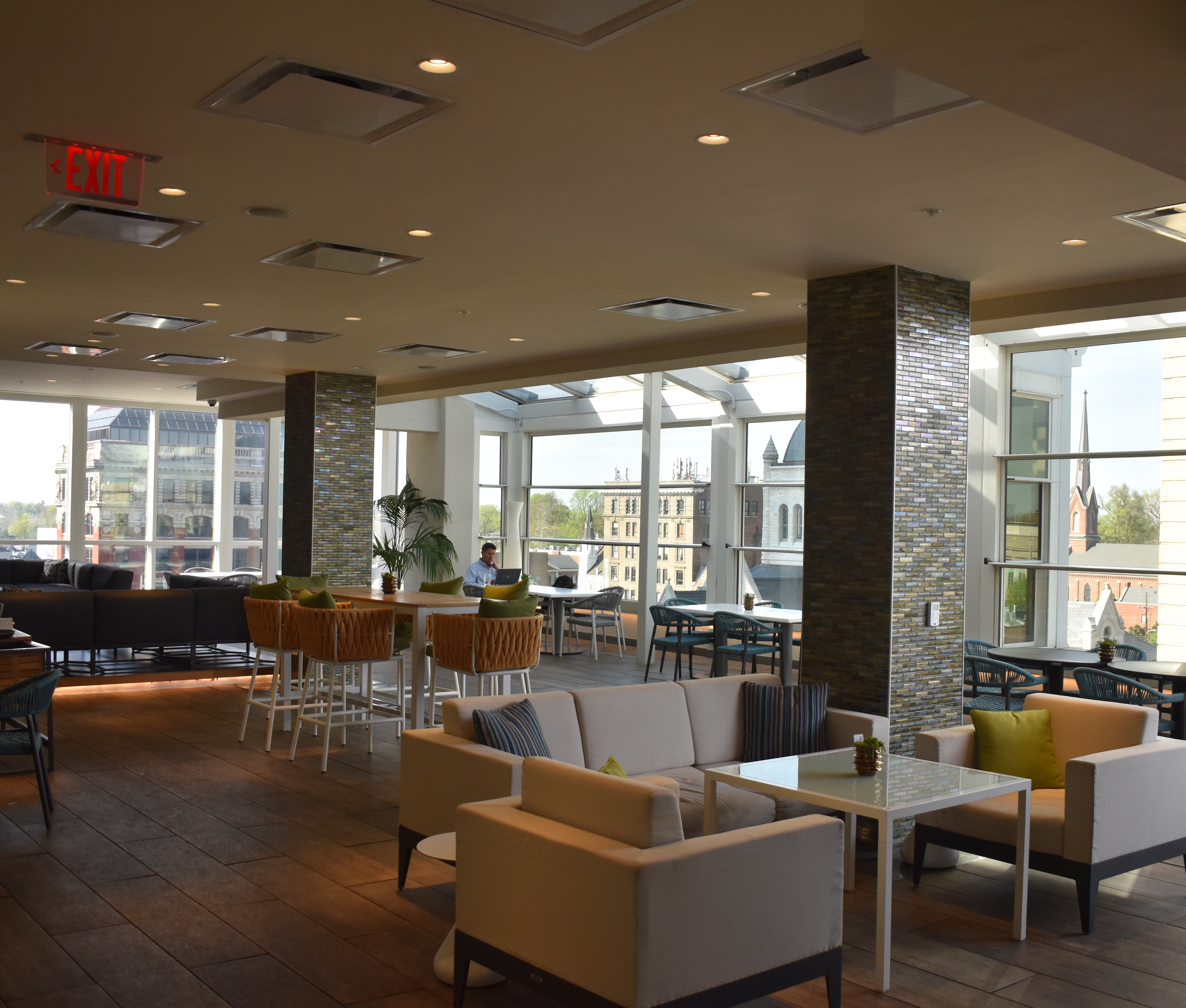 SkyBar might be our new favorite Lexington restaurant. It is a sleek 21st Century rooftop eatery with spectacular views of the city. It sits atop the Marriott Hotel. The mixed drinks here are the best in town. But they offer some great food. For starters, at Lunch, they offer the city's finest Grilled Cheese Sandwich (sourdough, sun dried tomato basil, cheddar, beemster, munster). But they also serve a great BLT, plus a Buffalo Chicken Wrap, Fried Chicken Club, Avocado Toast, Oven Roasted Salmon, one of the city's best versions of Fried Green Tomatoes, and a fine Soup of the Day. On different days, we've ordered three different Soups of the Day and all have been excellent. Proving their Cool, they stock Ale 8 and Jarritos. At dinner SkyBar really blossoms. Appetizers include Grilled Octopus, a fine Beer Cheese Platter, Fried Chicken Lollipops, those same Fried Green Tomatoes, and a creative mix of Sweet Corn, Bay Scallops, Queso Fresco and Chorizo. The Soup du Jour and Salads are excellent. The Signature Dish at Dinner is their Chicken & Grits (boneless chicken breast with drumette still attached, rondale zucchini and grits in a creamy mushroom sauce with house made chili oil). But there's also Salmon, Pasta Primavera, Steak Frites (Steak & Fries), and a Bluegrass Burger. Dessert options are a Honey Bourbon Cake, Creme Brulee, Root Beer Float Supreme (they add black pepper molasses gelato), Gelato, Tarts, and Sorbet. The bar here is a major attraction. They offer Craft Beers, a solid Wine List, and a tremendous Bourbon and Whiskey collection. The Cocktails are original, creative and memorable. |