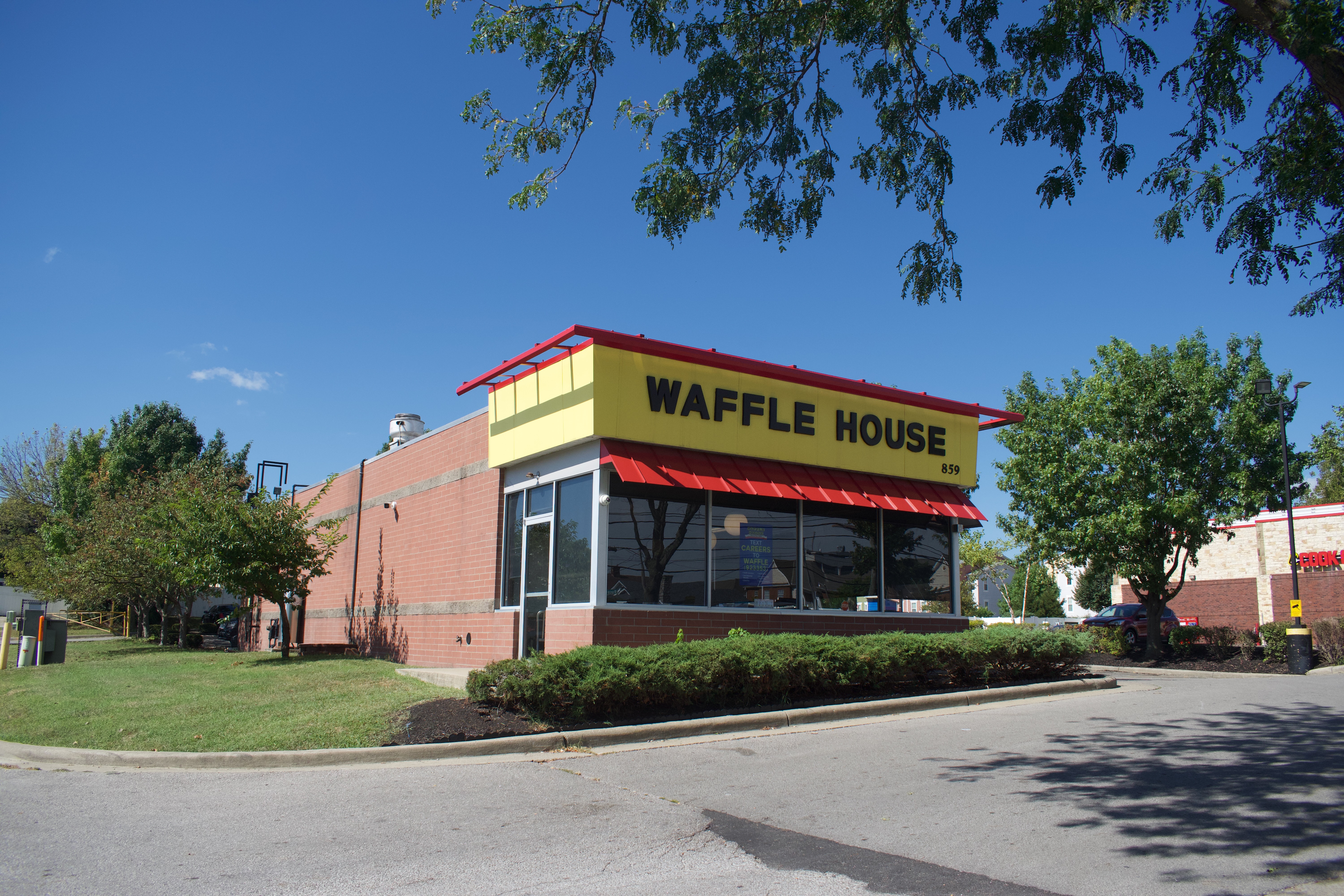 | Waffle House is famous for their waffles but ironically their menu features everything else. They promote their Steak & Eggs, Pork Chops & Eggs, Grilled Chicken & Eggs, Omelettes (Cheesesteak, Chili Cheese, Jalapeno and Ham & Cheese), Egg Sandwiches, Hash Browns and classic EggsnBacon or Ham & Egg plates. They're also pretty proud of their biscuits, sausage and bacon sides. Finally, they get around to their Waffles. Their basic is the classic Butter Milk Waffle. There are Double Waffles and Waffles With Sausage or Ham or Eggs. You can pick from Pecan, Chocolate Chip, Blueberry and Strawberry. Actually, we regret the evolution of Waffle House. Way back there, they served ONLY waffles, two pages of every variation imaginable. We could try waffles here we could never find anywhere else and couldn't fix ourselves. Now they've diversified, but the waffle choices are narrowed. Luckily, they still do a good job, with waffles and everything else. The campus Waffle House is over on South Broadway. |
